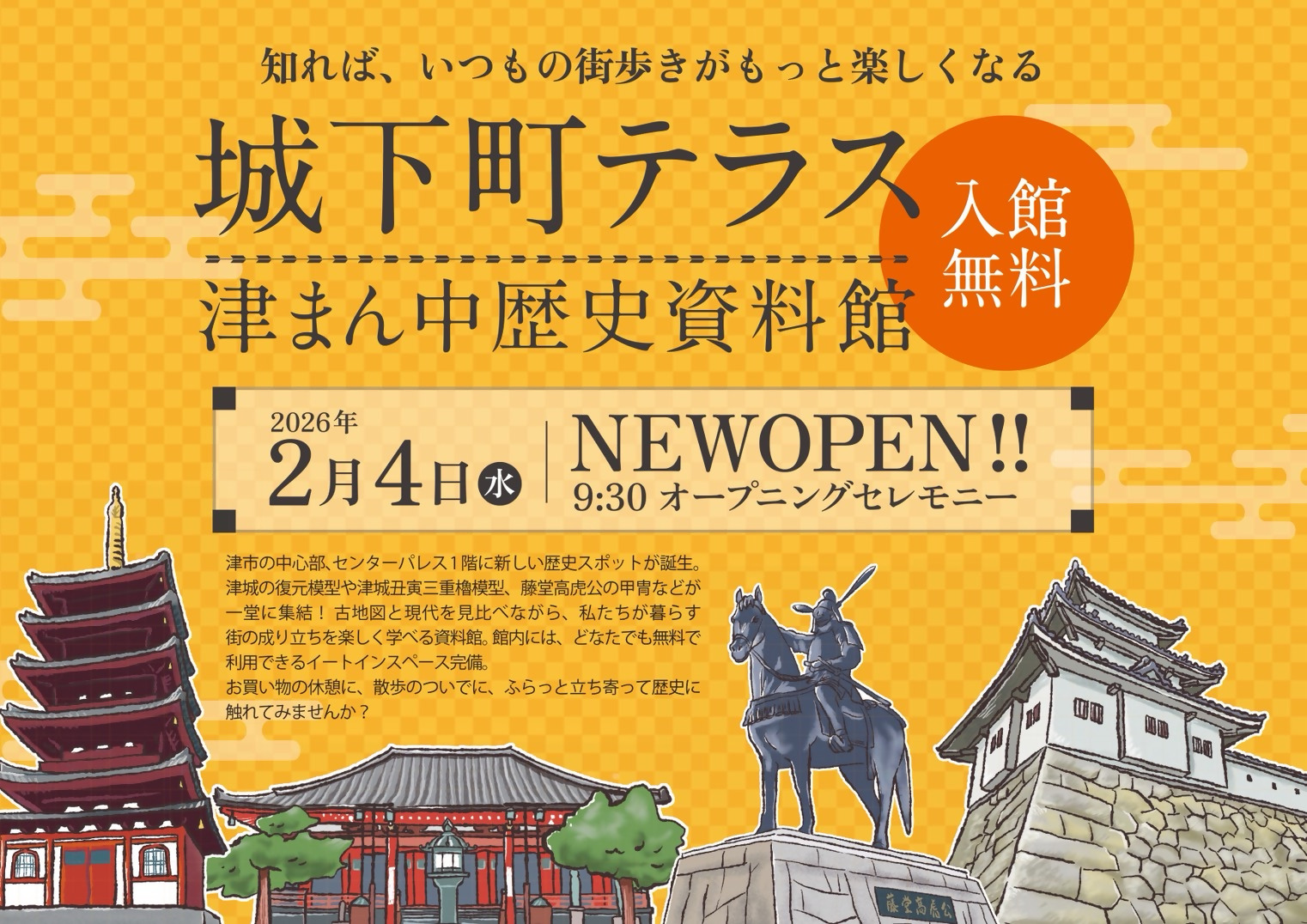 エリアプラットフォーム「大門・丸之内 未来のまちづくり」では、津センターパレスビル1階の一部フロアを使用し、2月4日(水)から「城下町テラス ー津まん中歴史資料館ー」を開設します!!