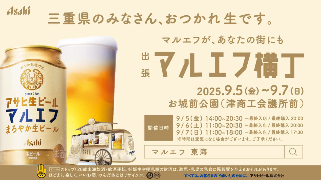 2023年から2024年にかけて全国を周遊し、大好評を博した「出張マルエフ横丁」が津市に帰ってきます!「出張マルエフ横丁」では、まろやか注ぎ・シャープ注ぎなどビールの注ぎ方によって変わる味わいや、"マルエフ"と"黒生"を1:1で混ぜる「ハーフ&ハーフ」、2:1で混ぜる「ワンサード」など、幅広い飲み方を楽しむことができます。また、Tシャツやグラスなどのオリジナルグッズの販売を実施します。是非ご来場ください!(^^)